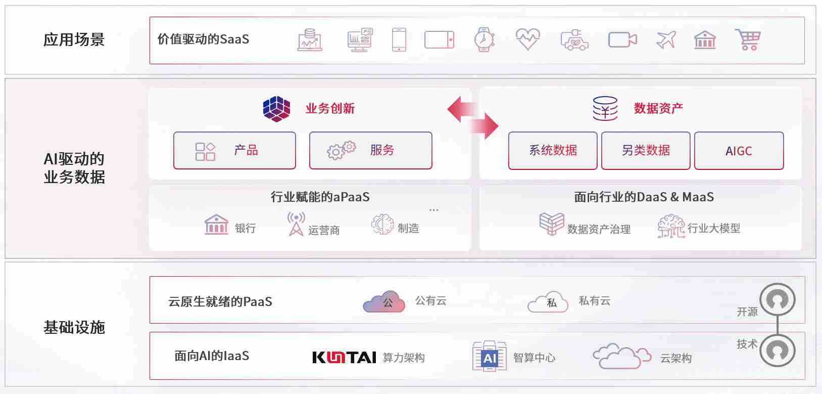 数字时代,,围绕企业数字化转型的关键要素,,,伟德国际1946bv数码开创性的提出数云融合战略和技术体系框架,,,,着力在云原生、、、、数字原生、、、AI原生和信创产业上架构产品和服务能力,,为处在不同数字化转型阶段的快消零售、、、汽车、、、金融、、医疗、、政企、、、、教育、、运营商等行业客户提供泛在的敏捷IT能力和融合的数据驱动能力,,构建跨界融合创新的数字业务场景和新业务模式,,,助力企业级客户建立面向未来的核心能力和竞争优势,,,,全面推动社会的数字化、、、智能化转型升级。。
