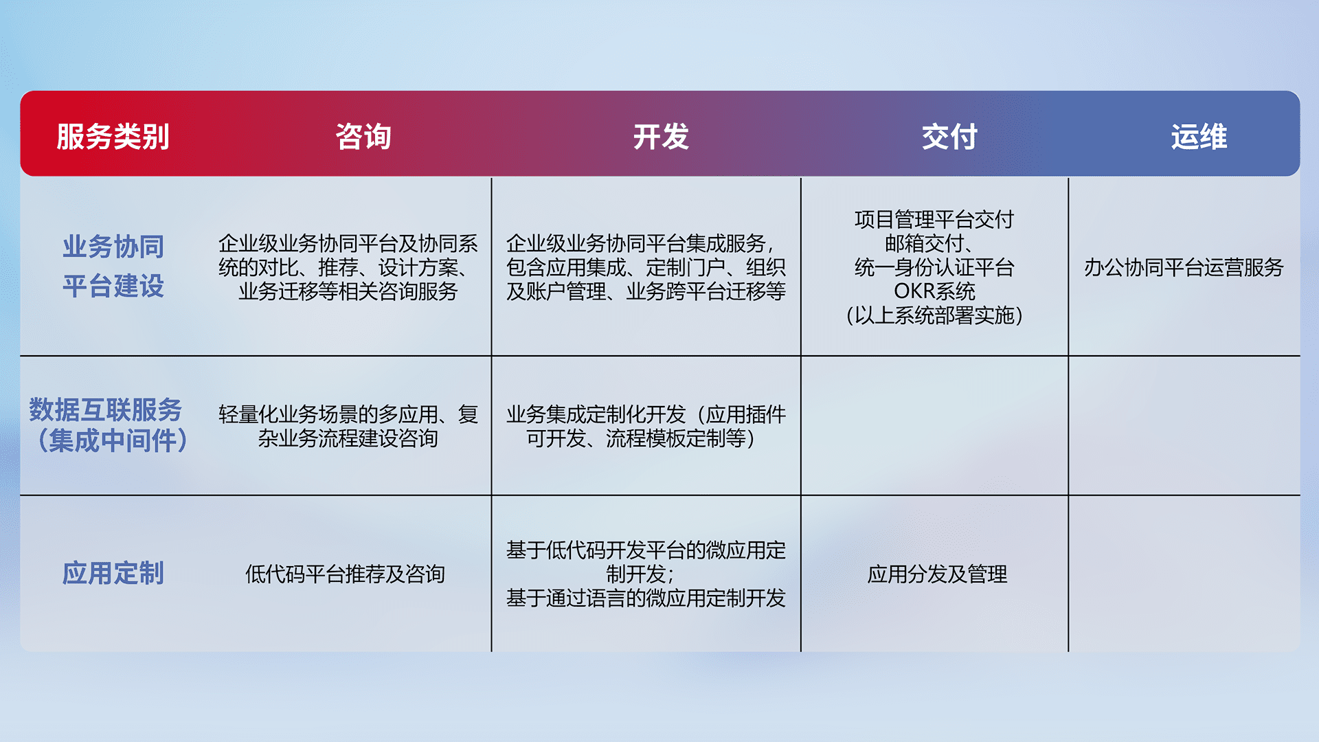 针对钉钉、、、、企微、、IDaas等平台级产品提供产品的规划、、、、方案、、交付、、、、定制化开发等服务,,,实现如统一协同办公、、、、智能客户服务、、、、混合会议管理、、智能数据查询、、、等业务场景,,实现数字化转型。。。。