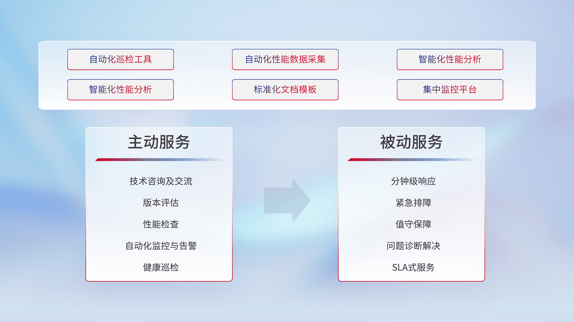智能化工具和标准化文档,,,保障服务质量,,提供主动服务(包含技术咨询、、、版本评估、、、、性能检查、、、、自动化监控与告警、、健康巡检)和被动服务包含(分钟级响应、、紧急排障、、、值守保障、、、、问题诊断解决、、、SLA服务)。。